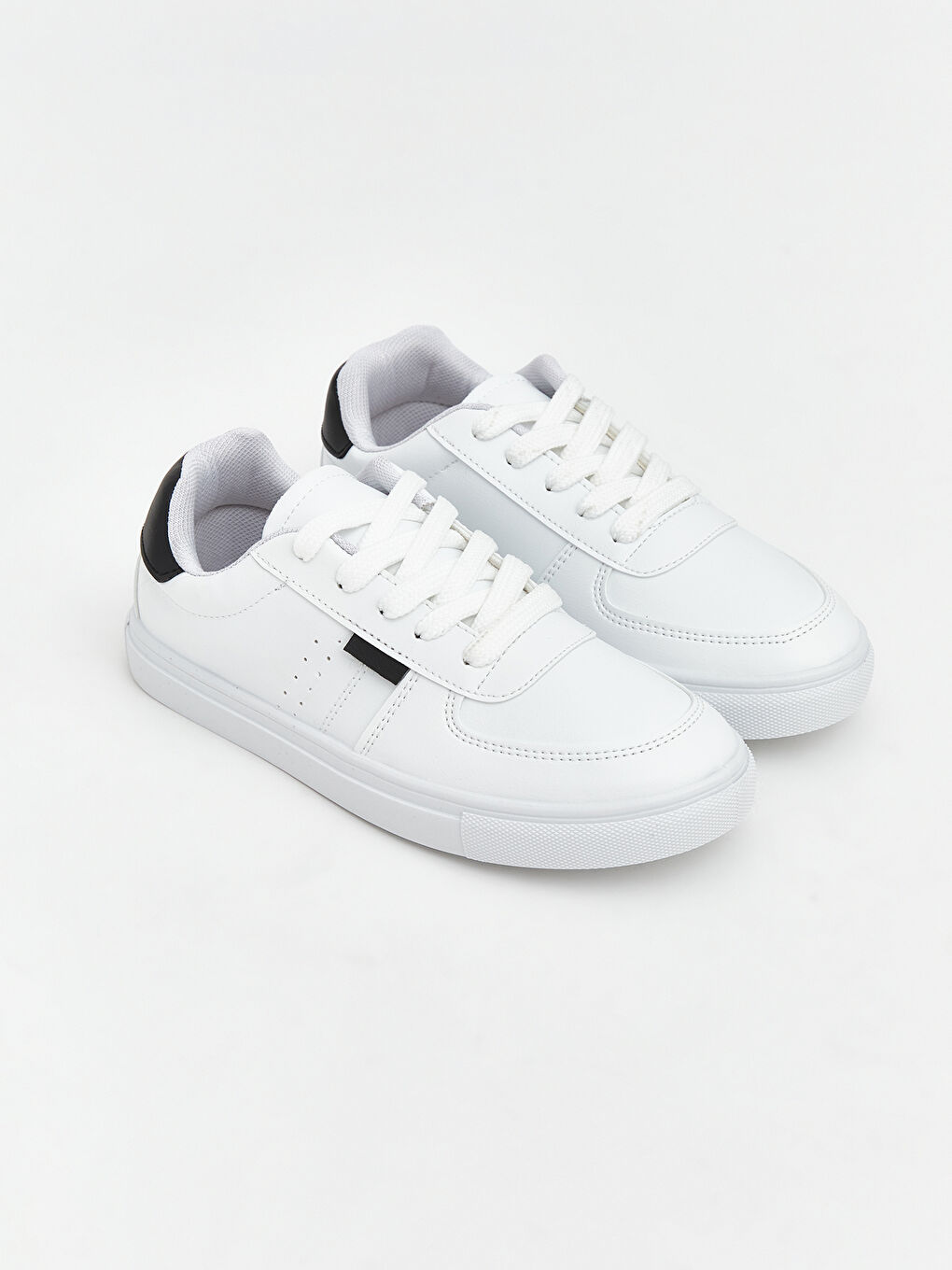 کفش کتانی پسرانه با بند و پنجه گرد. کفی صاف و دوختهای ریز در کنارهها دارد.