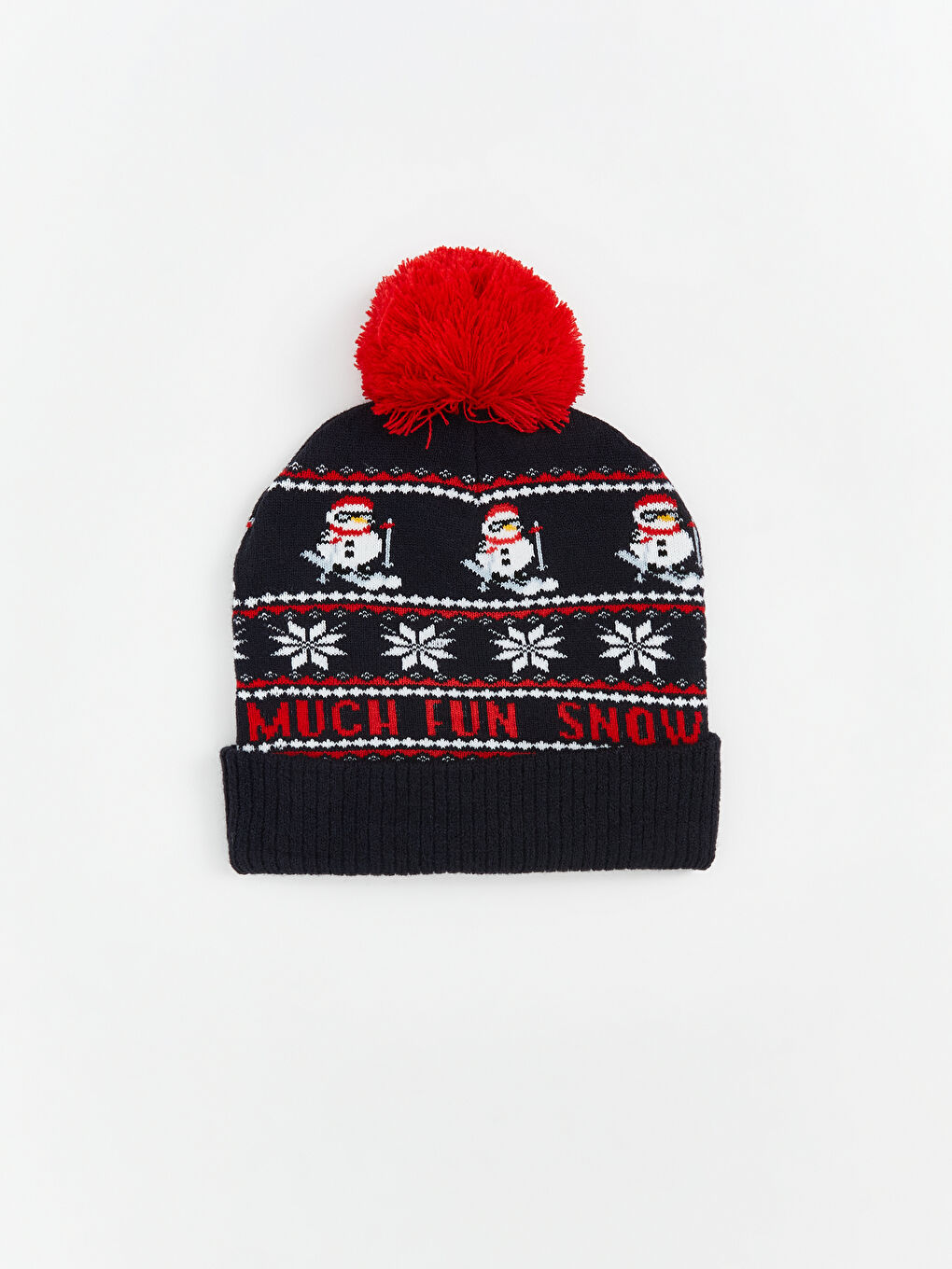 این کلاه بافتنی مردانه، با طرح آدم برفی و دانه برف، از پارچه کشباف ساخته شده است. در قسمت بالا دارای یک طرح منگولهدار و در قسمت سرآستین تاشو دارای نوشته است.