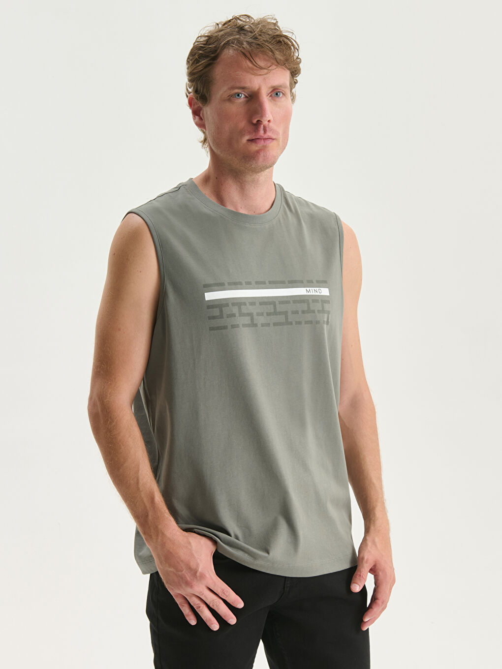 این تاپ مردانه بدون آستین یقه گرد از پارچه جرسی ۱۰۰٪ نخی ساخته شده و دارای طرح چاپی در قسمت جلو است.