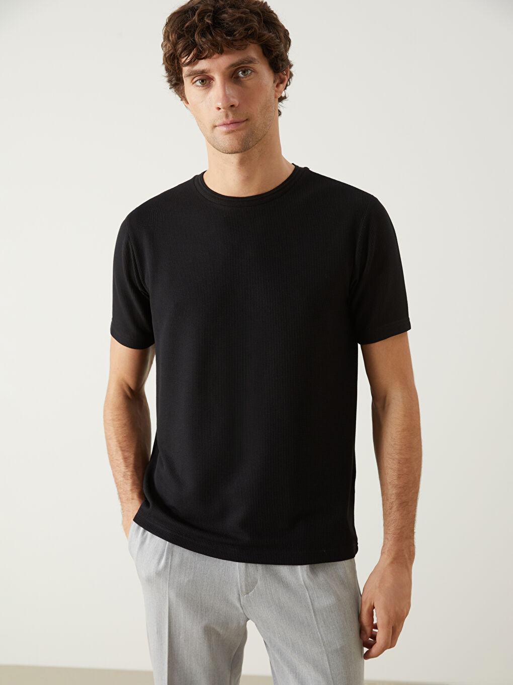 این تیشرت مردانهی اسلیم فیت، یقه گرد و آستین کوتاه است و از پارچهی ژاکارد ساخته شده است.