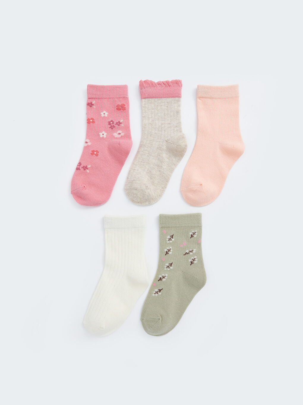 این ست پنج جفتی جوراب دخترانه نوزادی شامل مدلهای گلدار، راهراه و ساده است. یکی از جورابها دارای جزئیات چیندار در مچ پا است.
