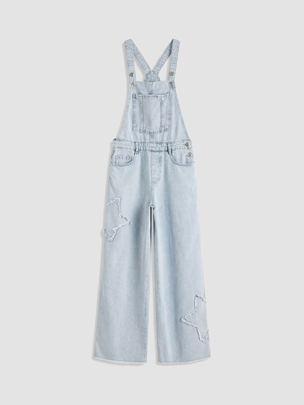 سرهمی جین دخترانه با گلدوزی ستارهای، بند و جیب.