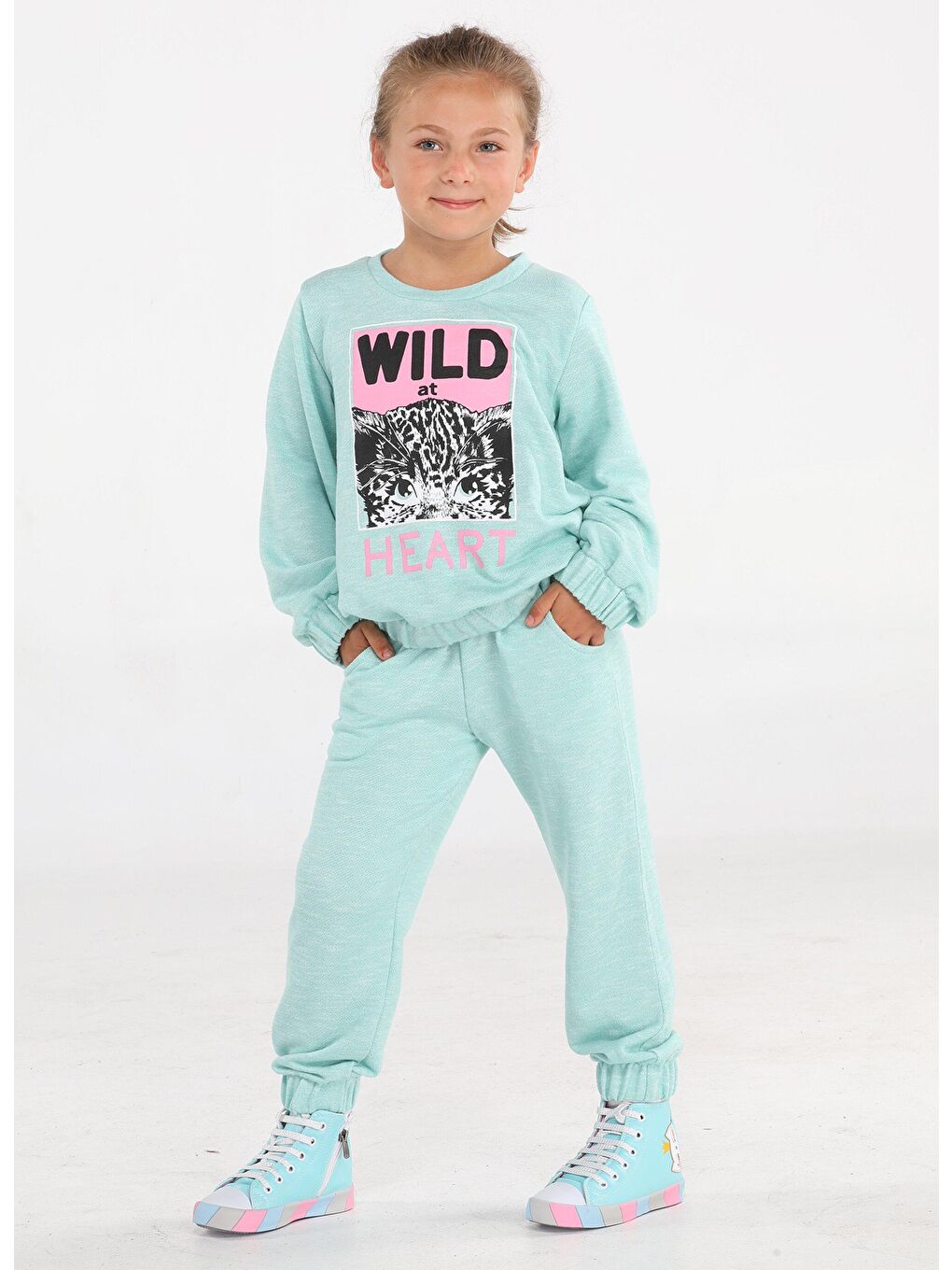 ساخته شده از پارچه پنبه ای روان با 3 نخ. نعناع Jogger Cut با دو سویشرت و شلوار کش دار، ست 2 تکه لباس ورزشی دخترانه. 100% پنبه.