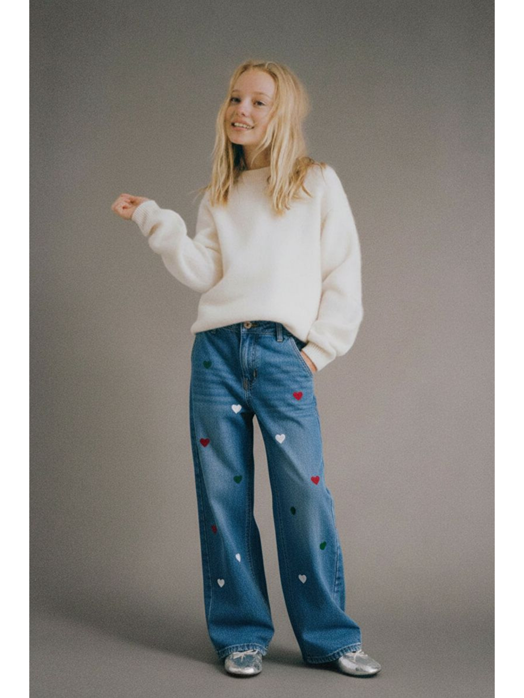 شلوار جین دخترانه نخی دمپا گشاد طرح قلب آبی – راحت و بادوام