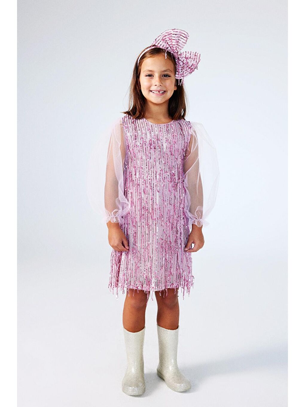 لباس آستین بلند حاشیه دار از مواد 100 پلی استر ساخته شده و دارای آستر داخلی است. یک اکسسوری تاج همسان نیز با این لباس موجود است که ظرافتی را به لباس می بخشد. طرحی را ارائه می دهد که هم زیبا و هم راحت است.