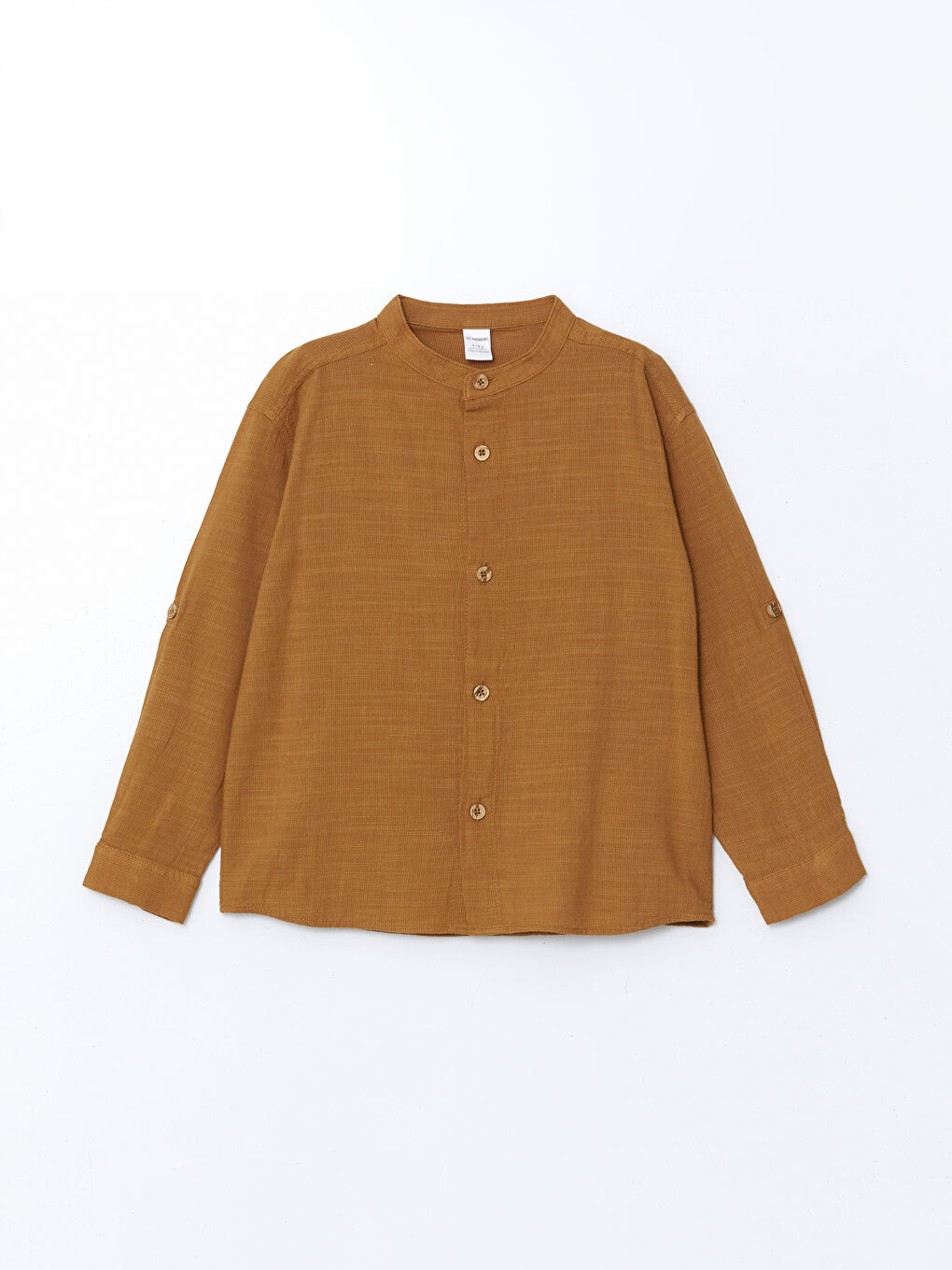 این پیراهن پسرانه ساده دارای یقه ماندارین و آستین‌های بلند است و از پارچه بافت‌دار ساخته شده است.