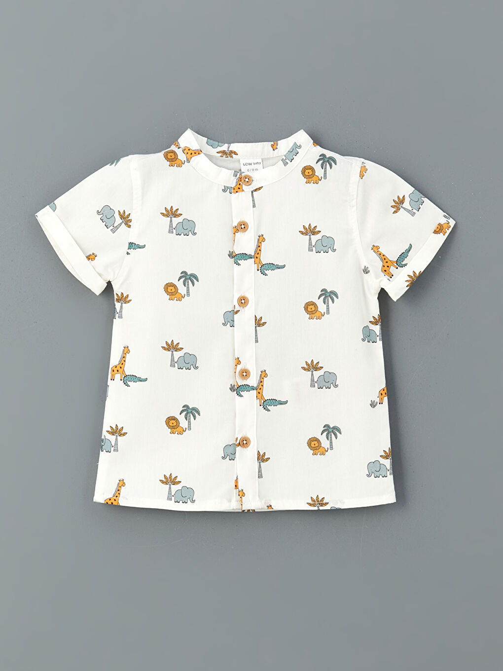 پیراهن نوزاد پسرانه با یقه نارنگی و آستین کوتاه از پارچه طرح دار حیوانات ساخته شده است و جلو دکمه دار است.