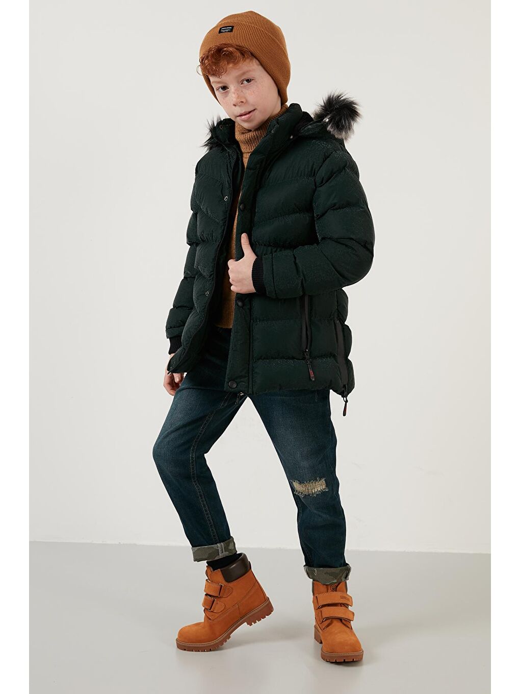 پالتو پسرانه زمستانی مخمل خاکی آستردار با یقه خز مصنوعی و کلاه جداشدنی ۵۷۶۱۹۰۶