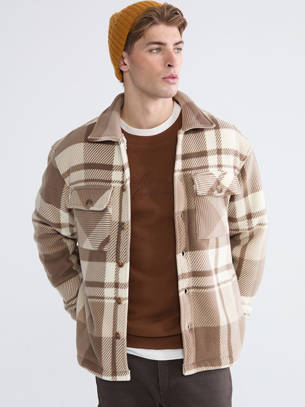 ژاکت پیراهن مردانه طرح شطرنجی بژ و ریلکس فیت