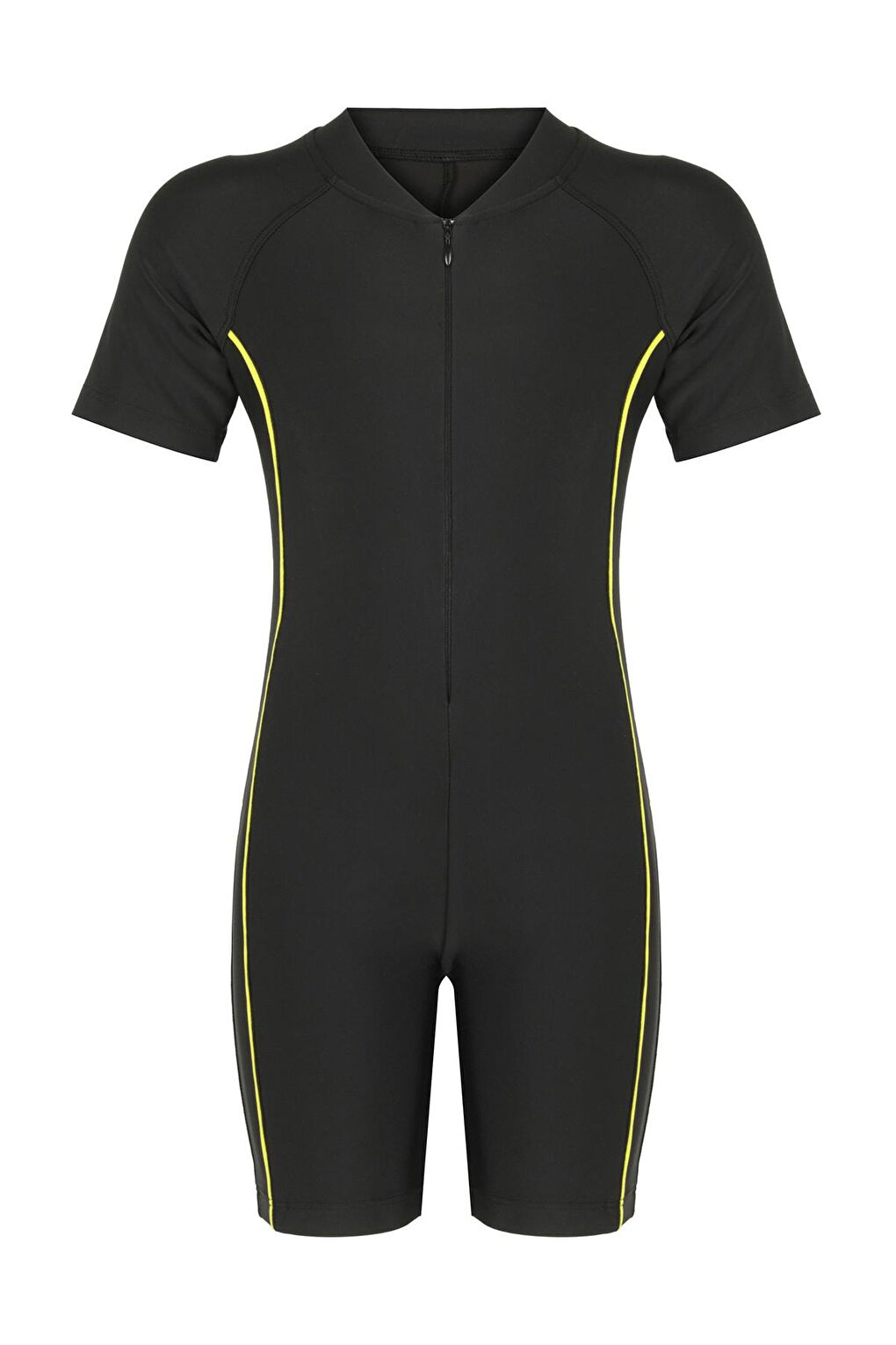 مایو بچه گانه آستین کوتاه مشکی با ریزه کاری زرد در لبه ها با کلاه شنا به فروش می رسد. مایو ما که پارچه ای راحت برای کودکان دارد از لیکرا و پارچه تمام شده ساخته شده است. به لطف زیپ آن به راحتی می توان آن را پوشید و برداشت. برای دختران و پسران مناسب است. 86% پلی استر 14% الاستین
