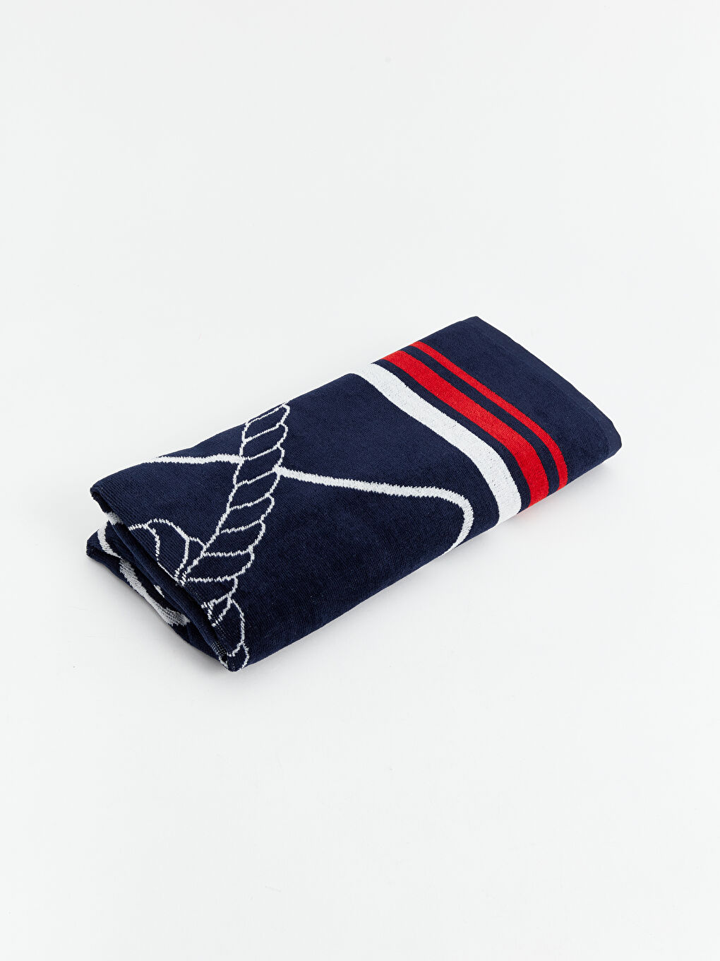 این حوله که با نوارهای سفید و قرمز در زمینه آبی تیره تزئین شده است، با یک موتیف لنگر بزرگ در وسط جلب توجه می کند. ساخته شده از مواد پنبه ای مرغوب، آب را به خوبی جذب کرده و به سرعت خشک می شود.