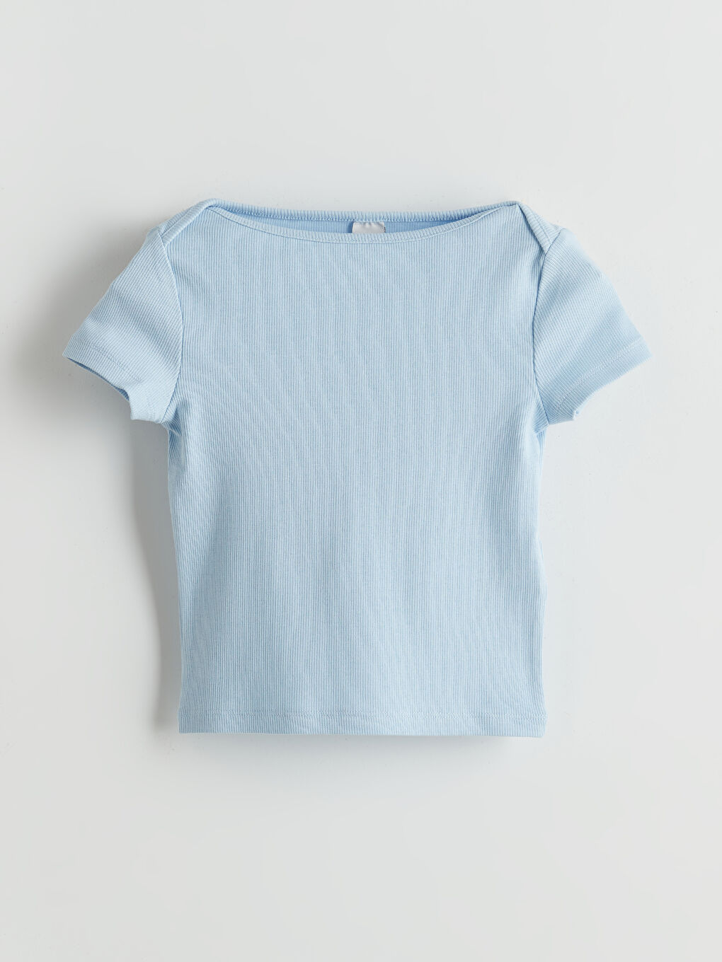 این تی شرت دخترانه آستین کوتاه با یقه قایق باریک از پارچه دنده پنبه ای بلند ساخته شده است. روی شانه ها بسته می شود.