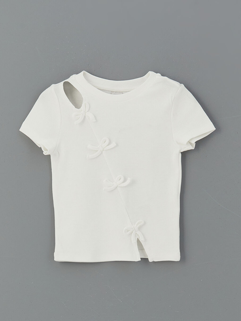 یک تیشرت دخترانه باریک از پارچه پنبهای با یقه خدمه، آستینهای کوتاه، جزئیات برشخورده روی شانهها و تزئینات پاپیونی در جلو.