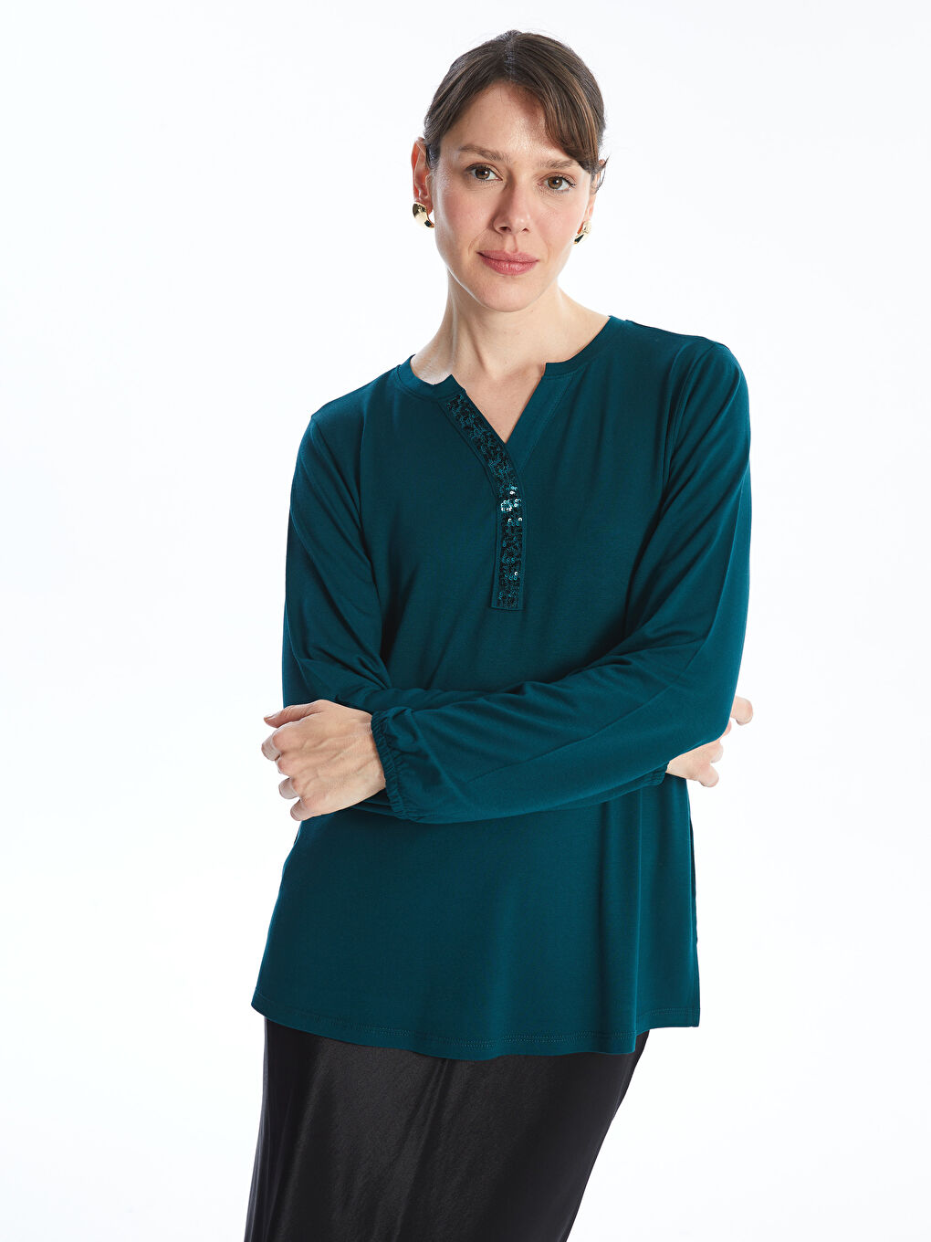 بلوز آستین بلند پولک دوزی شده از یقه پارچه ای تکی ساخته شده است. با ساختار سبک و تنفس پذیر خود خنکی را در تابستان فراهم می کند. دارای جزئیات الاستیک است که دور مچ دست میپیچد.