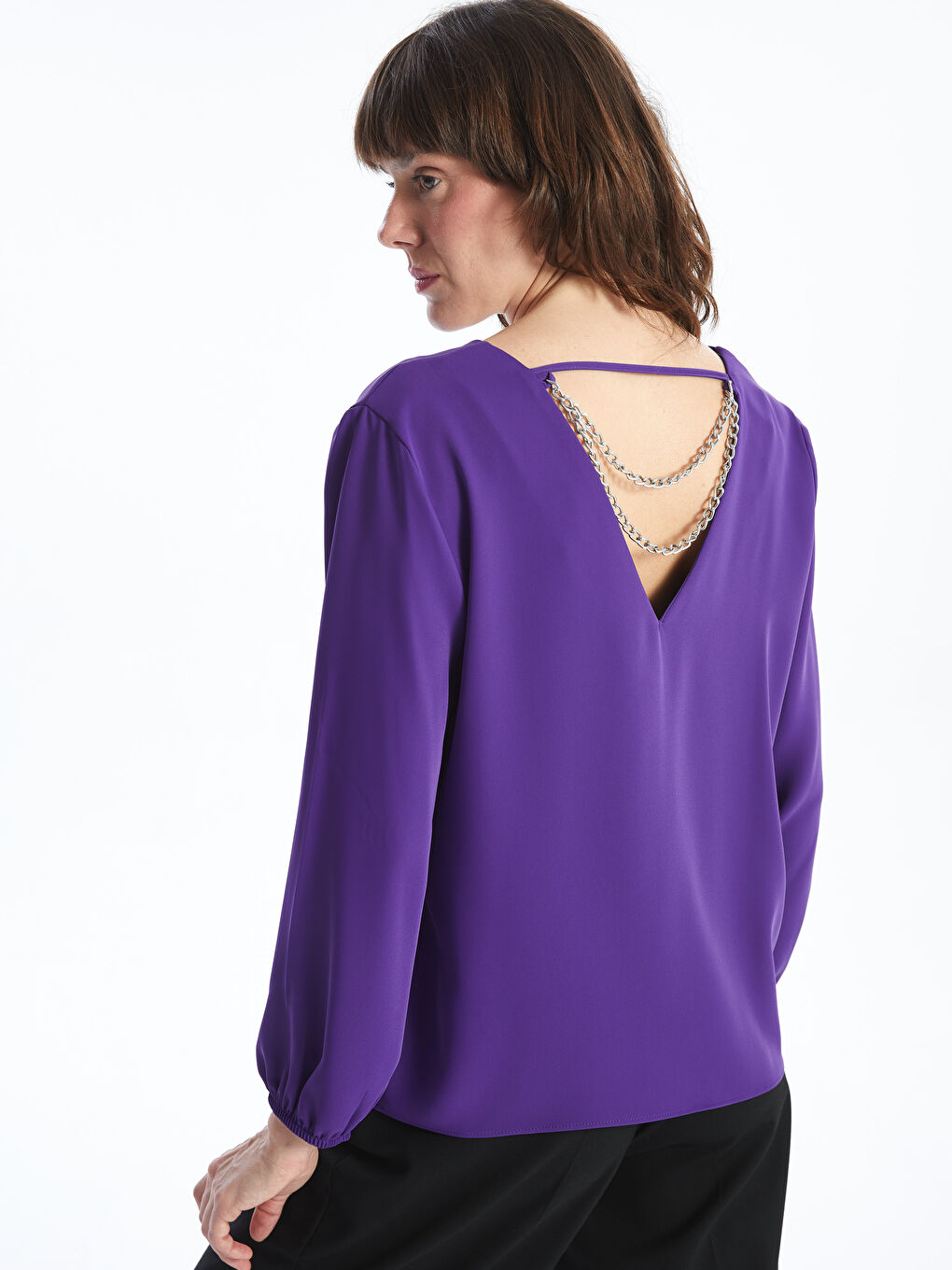 بلوز زنانه آستین بلند ساده یقه V هم ظرافت و هم راحتی را با هم ترکیب می کند. جزئیات ارتجاعی در انتهای مچ دست، ظاهری مدرن به بلوز میافزاید، در حالی که جزئیات زنجیرهای در پشت، فضایی زیبا را به طرح اضافه میکند.
