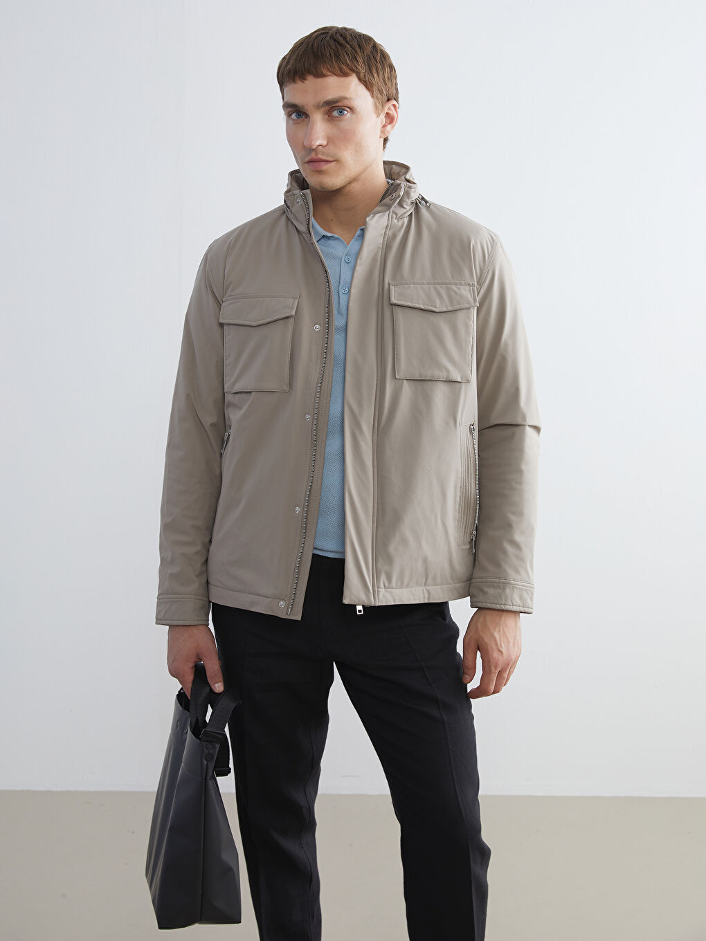 ژاکت مردانه با یقه ایستاده و مقنعه ثابت، آستین بلند، بسته شدن زیپ جلو، جیب های قفسه سینه و جیب های زیپی در کنار.