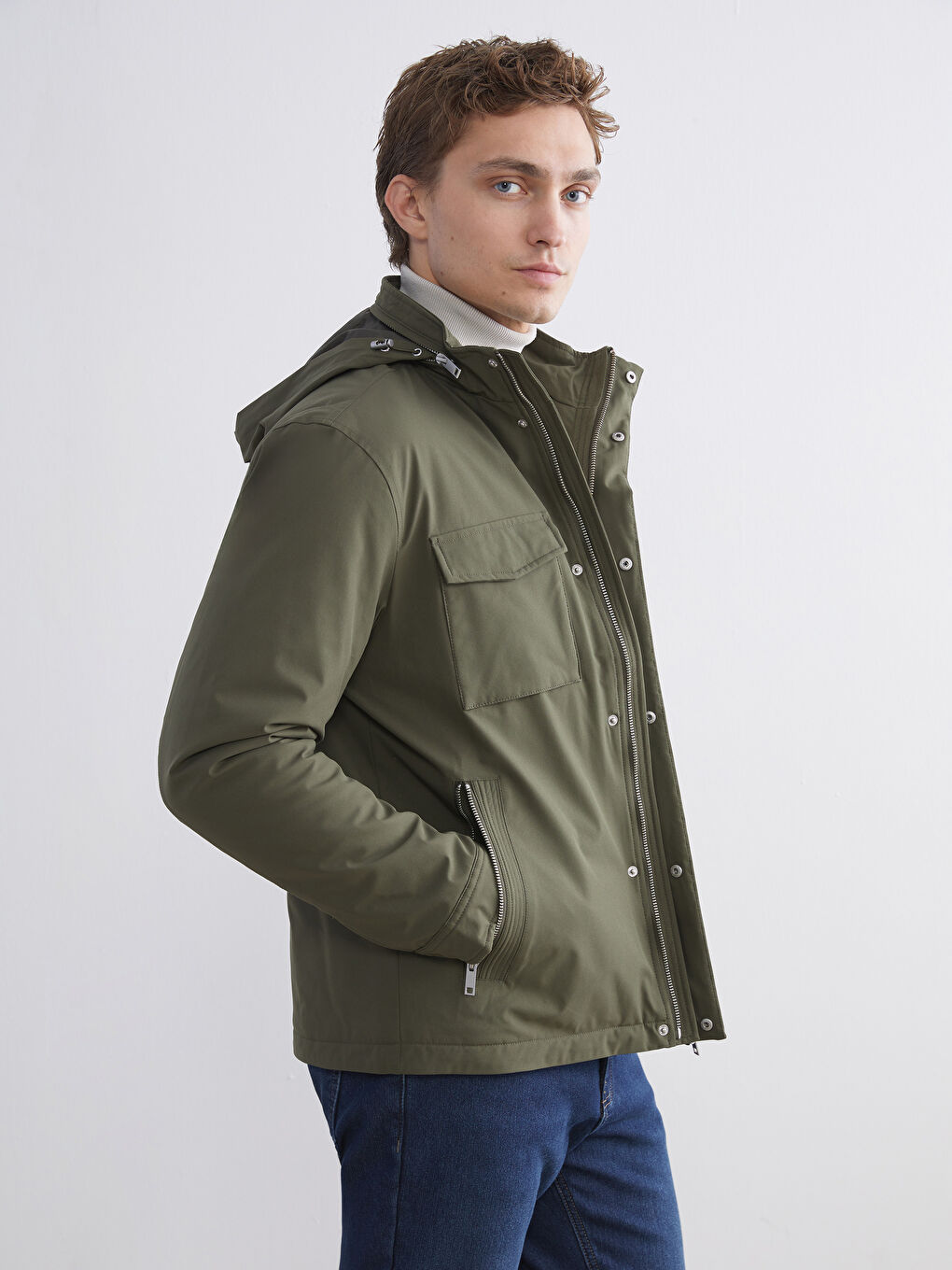 ژاکت مردانه با یقه ایستاده و مقنعه ثابت، آستین بلند، بسته شدن زیپ جلو، جیب های سینه و جیب های زیپی در کنار.